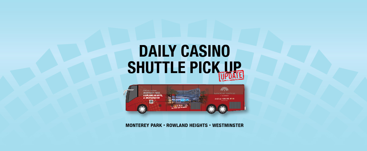 SHUTTLE SPECIAL ....... TICKET INFORMATION Service is operated by W&H Trade Inc. Bus company is an independent contractor, not an employee, agent or otherwise affiliated with Parkwest Bicycle Casino. Must be 21 years of age or older with valid ID. Casino reserves the right to change or cancel promotions at any time. All management decisions are final. See casino for full details. Gamble Responsibly 1-800-Gambler. GEAR-001289, GEAR-001291, GEAR-001292. BSIS LICENSE NO. 1358