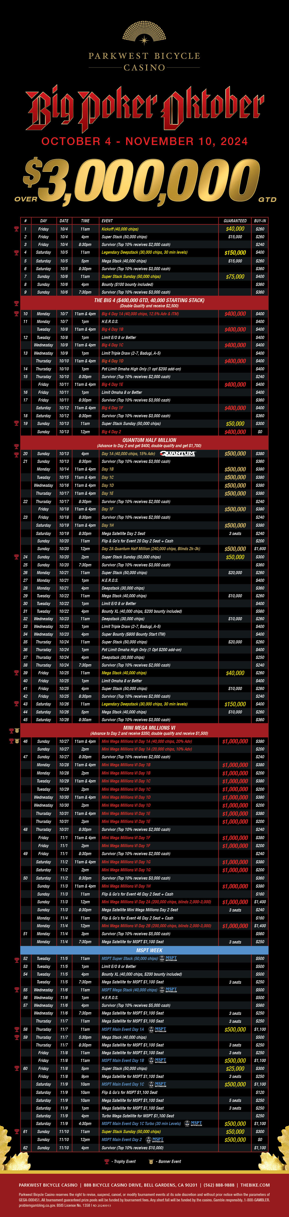 | 11/9/2024 | 10AM | $250 | MEGA FOR EVENT #58 DAY 2 SEAT (5 SEATS GTD) | Structures | Results | |